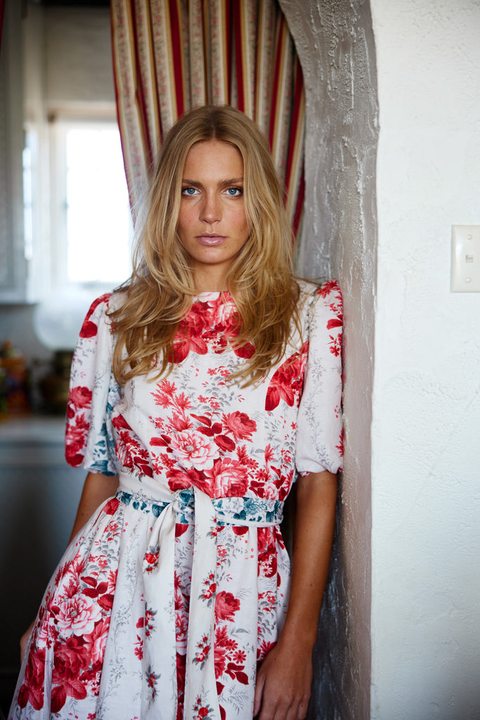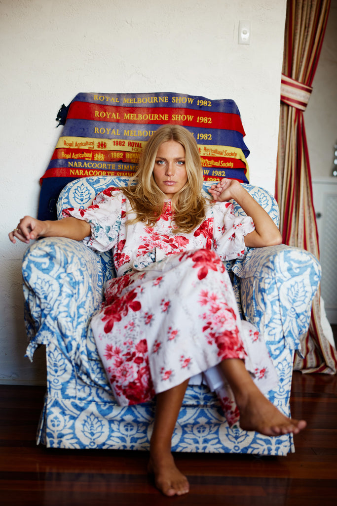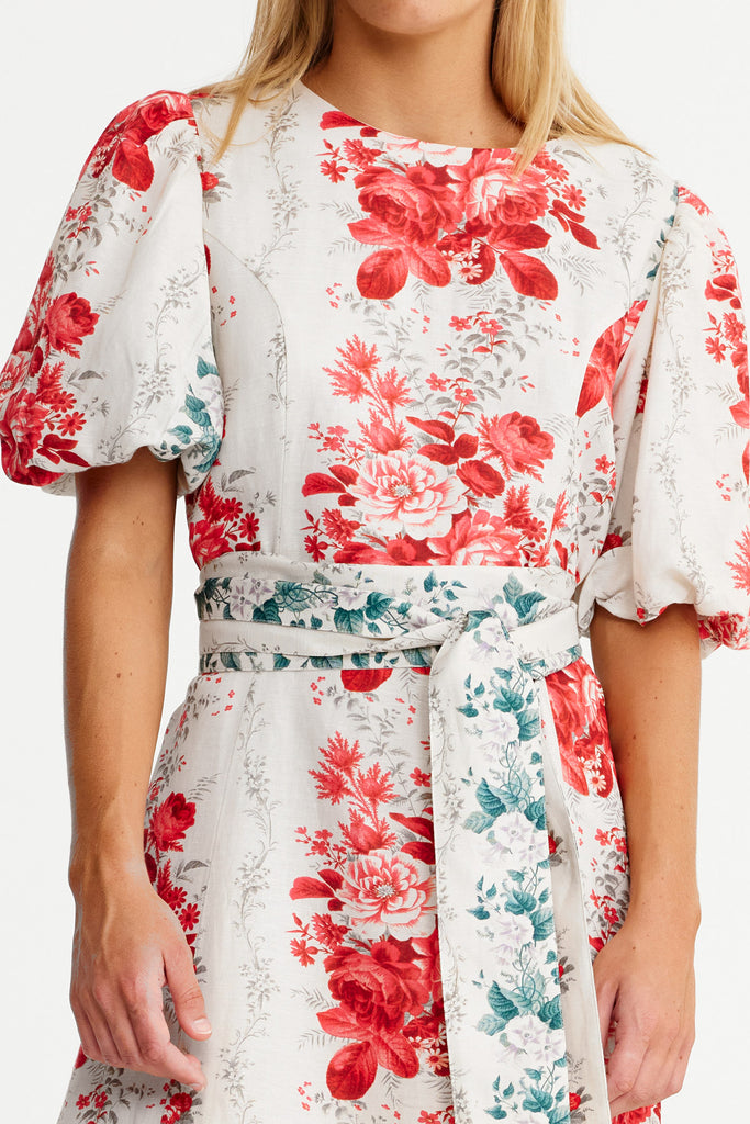 The Magic Millions. A famous race, polo match & throughbred auction house. And a dress to impress the bookies, the blokes & your best friends in a beautiful marquee watching your filly. Win. The Magic Millions. An unforgettable feeling of your heart in your mouth, hooves thundering the straight. So wear an equally unforgettable super pretty dress, a showstopper with all the feminine frills: Powder puff sleeves, a swishy midi skirt. Blue & scarlet tumbling floral wallpaper stripe panels of cool linen-viscose blend with a removable tie belt for versatility. Just as cool with your vintage sneakers, ballet flats or fringed loafer. Pockets & Very Very Pretty.