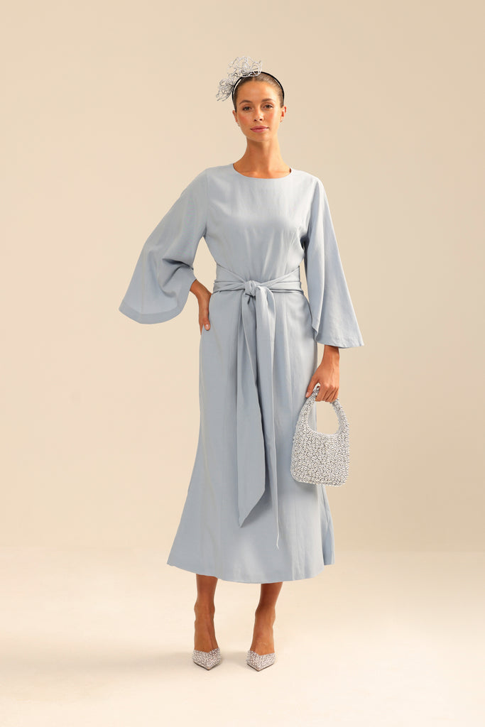 Bubbles first, horses second. This semi-fitted midi is cut from a drapey linen viscose blend, with flared sleeves & a kick out hem that floats as effortlessly as the corks pop. The removable tie lets you cinch for the win or keep it loose as the day wears on. A beautiful figure flattering silhouette. Perfectly primed for sipping, swanning, and staying just a little longer than you planned. In the perfect shade of dusty pastel blue, if you go to The Everest Carnival you are in the correct dress code too. Yoo Hoo!