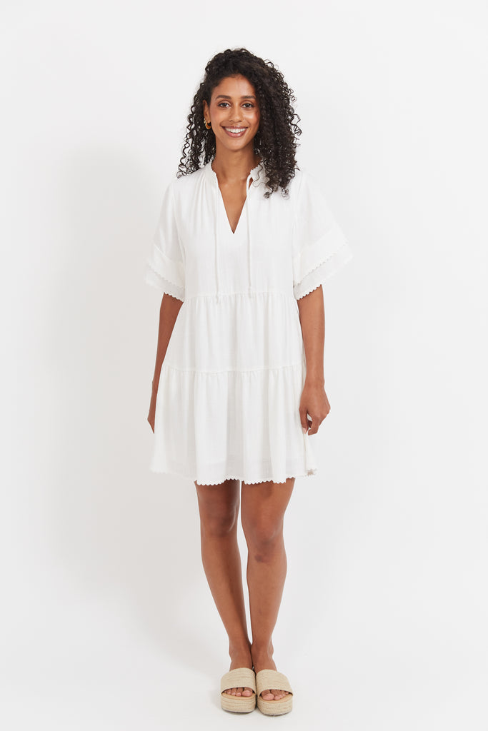 Slip into the Haiti Dress and instantly feel sun-kissed. This breezy beauty features a soft V-neckline with cotton ties, ric-rac trim, and a relaxed tiered silhouette. The short double-layer sleeves and airy linen blend add to its effortless charm, while internal side pockets keep it practical for days on the move.