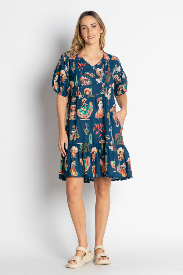 Brighten your wardrobe with the LulaLife Arriba Dress, a playful blend of comfort and style. Crafted in Australia from lightweight 100% cotton voile, this knee-length dress is perfect for warm-weather dressing. Featuring a relaxed fit with a flattering V-neckline, vertical tucks on the bodice, and tiered gathered panels, it offers a breezy and feminine silhouette. The gathered elbow-length sleeves with soft elastic hems add comfort, while practical side pockets make it easy to wear every day. Finished with a retro Mexican western-inspired digital print, this dress is a vibrant choice for summer outings, holidays, or casual weekends.