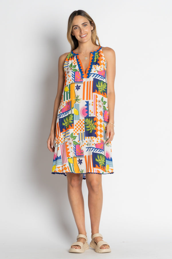 The Lyra Sundress in Ocean combines timeless elegance with effortless comfort. Featuring a knee-length shift silhouette and cutaway sleeves, it offers a flattering yet relaxed fit perfect for warm days. The V-neck enhances its refined style, while inset side pockets add practical charm. Its vibrant tropical print brings a fresh, sophisticated touch ideal for both casual and dressier occasions.