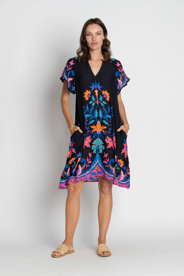 The LulaSoul Bahia Dress blends comfort and effortless elegance in a relaxed A-line silhouette. Crafted from soft 100% viscose modal, this lightweight dress features a flattering V-neck with a Nehru collar, knee-length hem, and practical side pockets. The loose raglan sleeves with braid edging add a chic touch, while the optional waist tie allows you to style it your way. Finished with a striking digital scarf placement print, this versatile dress is perfect for casual days, holiday wear, or elevated summer outings.