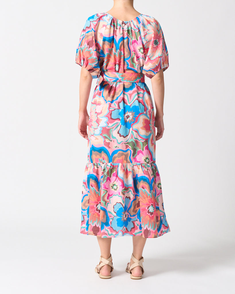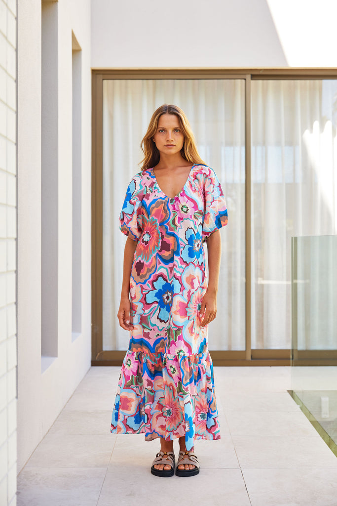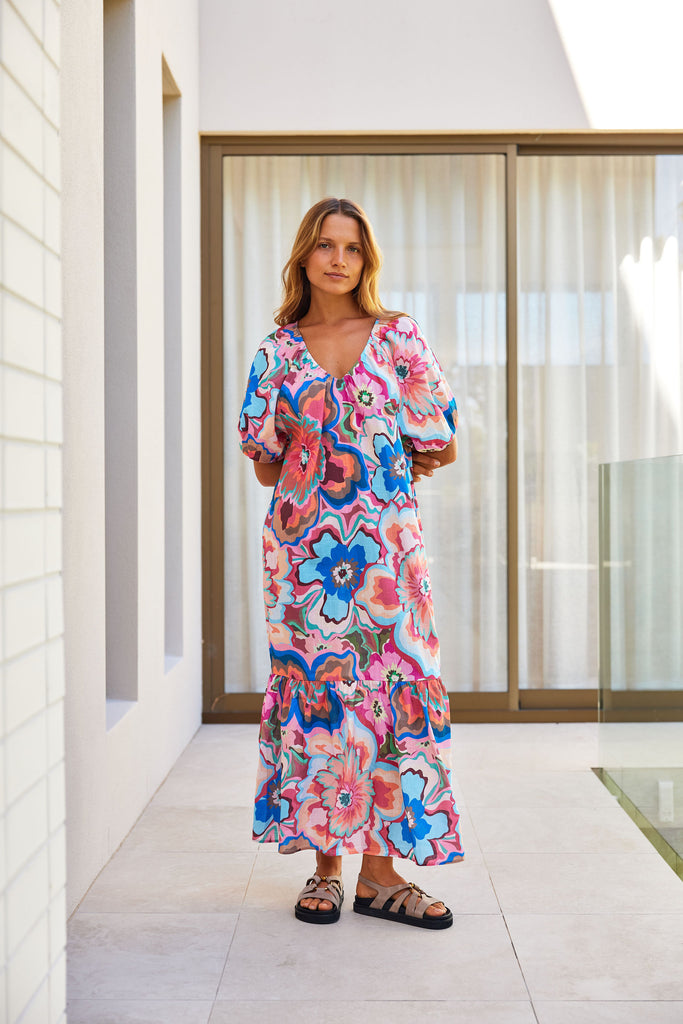 Say hello to dopamine dressing. The Hawaii Dress in Bomba Di Fiori is bursting with bold blooms and retro charm. Featuring a puff sleeve silhouette with a deep V neckline, statement buckle belt, and a tiered midi skirt, it’s the kind of piece that instantly lifts your mood. Lightweight and effortless with just the right amount of volume.