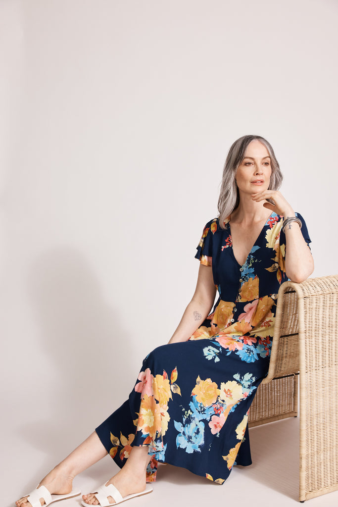 A romantic printed midi with flattering shape. Crafted from soft viscose and designed with flutter sleeves, deep V neckline, rouleau loop button front detail, and subtle waist shaping. Falls to a midi length with soft volume and functional pockets.