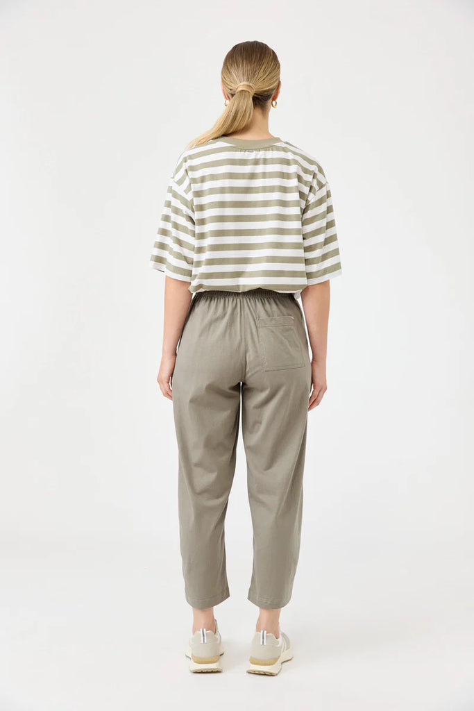 A casual staple designed for comfort on the go. Crafted from 100% cotton for natural softness. Features a wide shirred elasticated waistband, functional pockets, and a relaxed straight leg. Cropped length adds a modern touch.