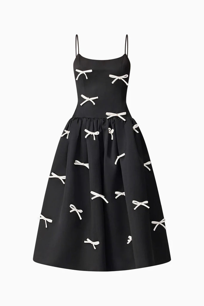 What sets this piece apart are the dimensional white bows with delicate pearl detailing, placed artfully across the front—offering a nod to vintage couture with a fresh, feminine twist. Whether you're attending a cocktail event, a formal gathering, or looking for a dress for a guest at a wedding, this refined style brings sophistication with a unique flair.