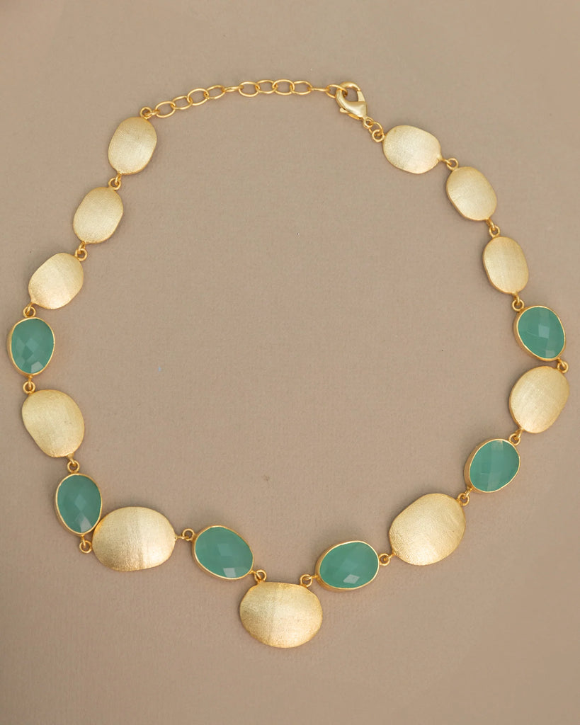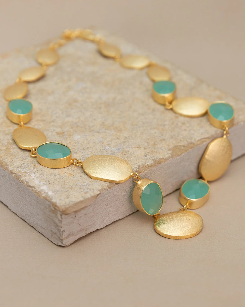 Discover our exquisite Dako Brass Necklace in Aqua chalcedony, a breathtaking and handcrafted creation. This stunning, artisanal piece combines the two elements for a unique and beautiful look.