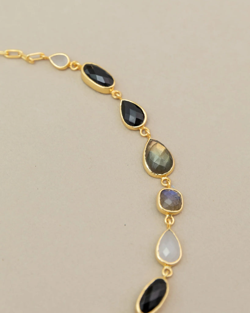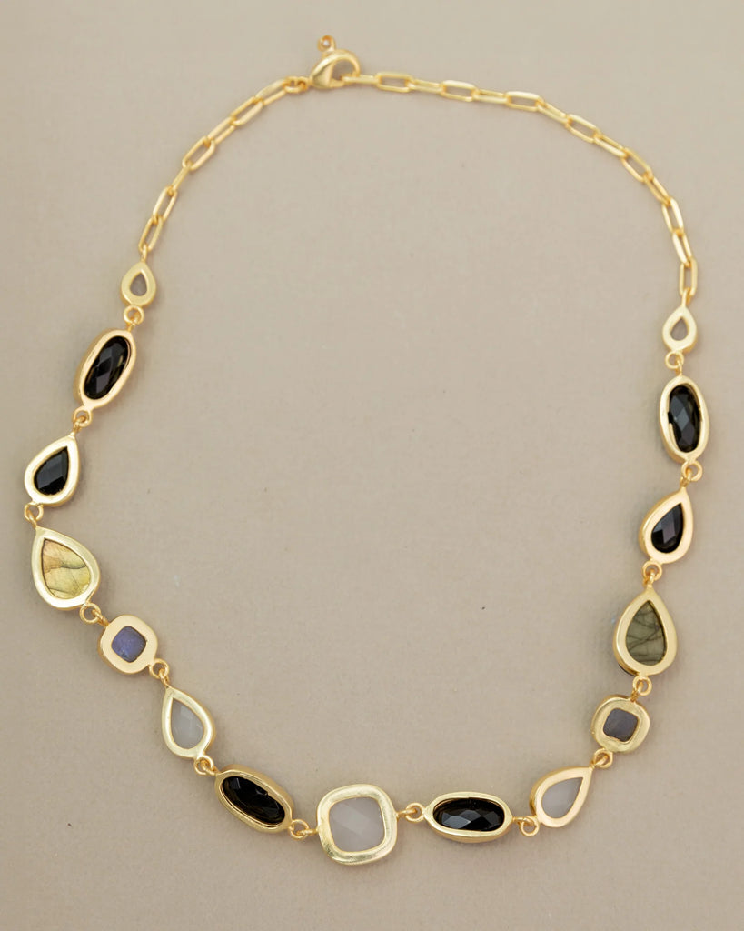 Discover our exquisite Trapeze Necklace in labradorites and moonstones - a breathtaking, handcrafted creation. A stunning asymmetry of gemstones for an elevated statement look.