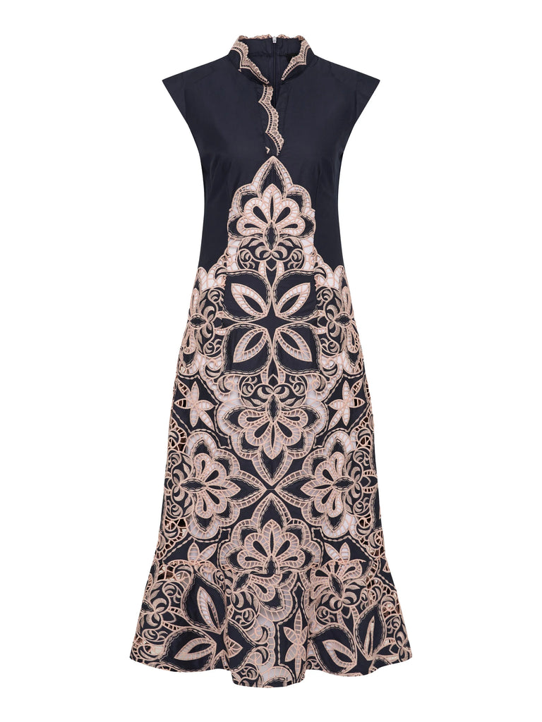 The intricate cut-out floral embroidery of the Sierra Midi makes it the perfect summer dress to leave an impression at any summer event. Featuring an art-deco design in blush on a navy base in a cotton blend, it is fitted through the body with panelling and falls to a flounce hem finishing at midi length. The embroidered floral motif continues with scalloped detailing on the open collar and draws the eye down the silhouette, adding texture and elegance. Effortless, chic worn day or night, comes with a cotton bias half-slip.
