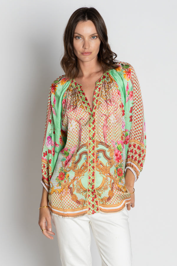 Elevate your everyday style with the LulaSoul Pellicano Top, a relaxed-fit design that blends comfort and elegance. Crafted from 100% satin modal, this lightweight, breathable top showcases a vibrant digital print inspired by coastal escapes. Featuring a round neck with soft gathers, button-through front, and shimmering matte gold micro-piping inserts, it delivers a touch of luxe to your casual look. The ¾ length raglan sleeves with elastic hems add ease and movement, while the curved hemline flatters every silhouette. Designed in Australia, this versatile piece pairs effortlessly with jeans, shorts, or skirts for a chic resort-to-city style.