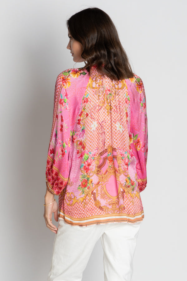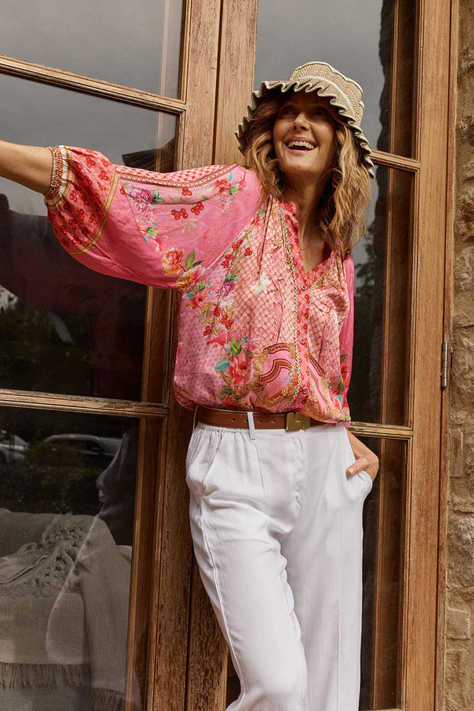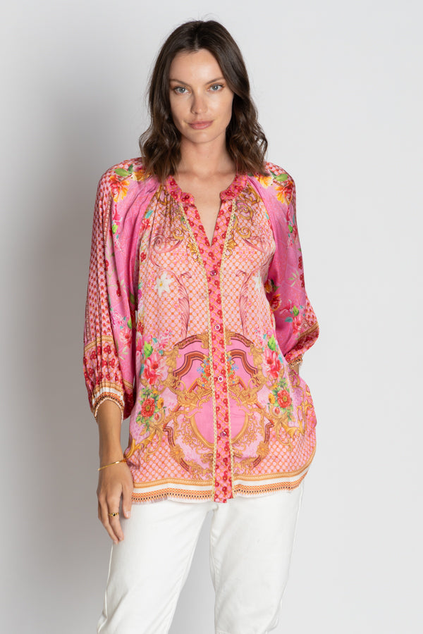 Elevate your everyday style with the LulaSoul Pellicano Top, a relaxed-fit design that blends comfort and elegance. Crafted from 100% satin modal, this lightweight, breathable top showcases a vibrant digital print inspired by coastal escapes. Featuring a round neck with soft gathers, button-through front, and shimmering matte gold micro-piping inserts, it delivers a touch of luxe to your casual look. The ¾ length raglan sleeves with elastic hems add ease and movement, while the curved hemline flatters every silhouette. Designed in Australia, this versatile piece pairs effortlessly with jeans, shorts, or skirts for a chic resort-to-city style.