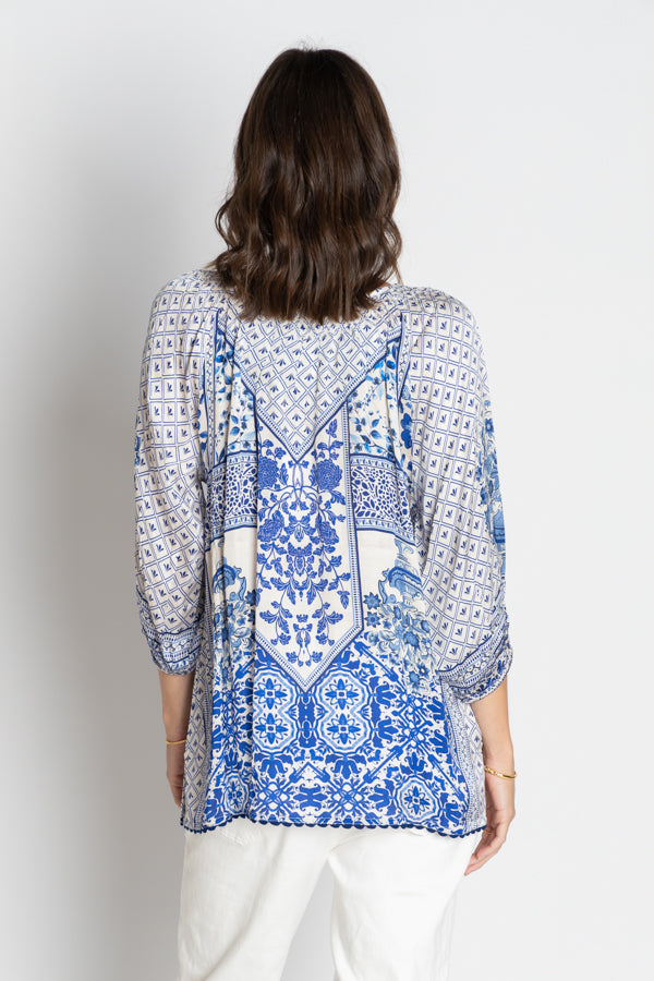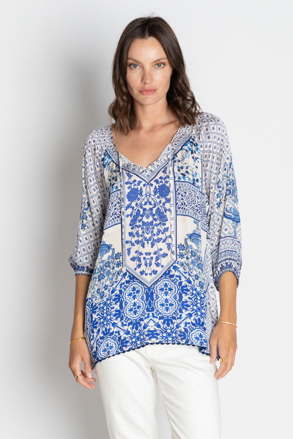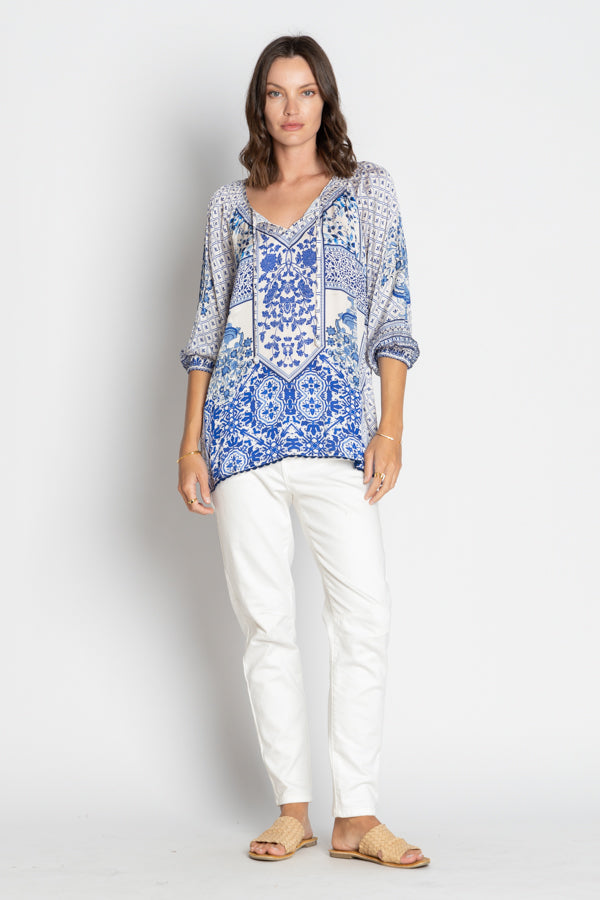 Elevate your everyday style with the LulaSoul Pellicano Top, a relaxed-fit design that blends comfort and elegance. Crafted from 100% viscose modal, this lightweight, breathable top showcases a vibrant digital print inspired by moroccan escapes. The ¾ length raglan sleeves with elastic hems add ease and movement, while the curved hemline flatters every silhouette. Designed in Australia, this versatile piece pairs effortlessly with jeans, shorts, or skirts for a chic resort-to-city style.