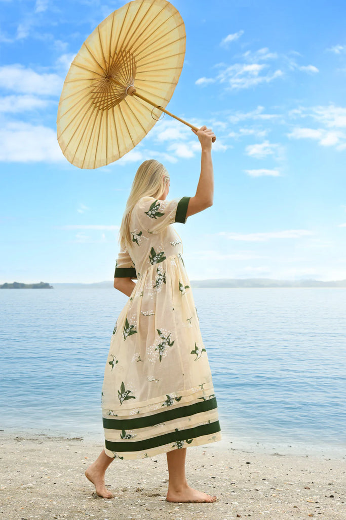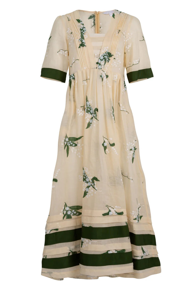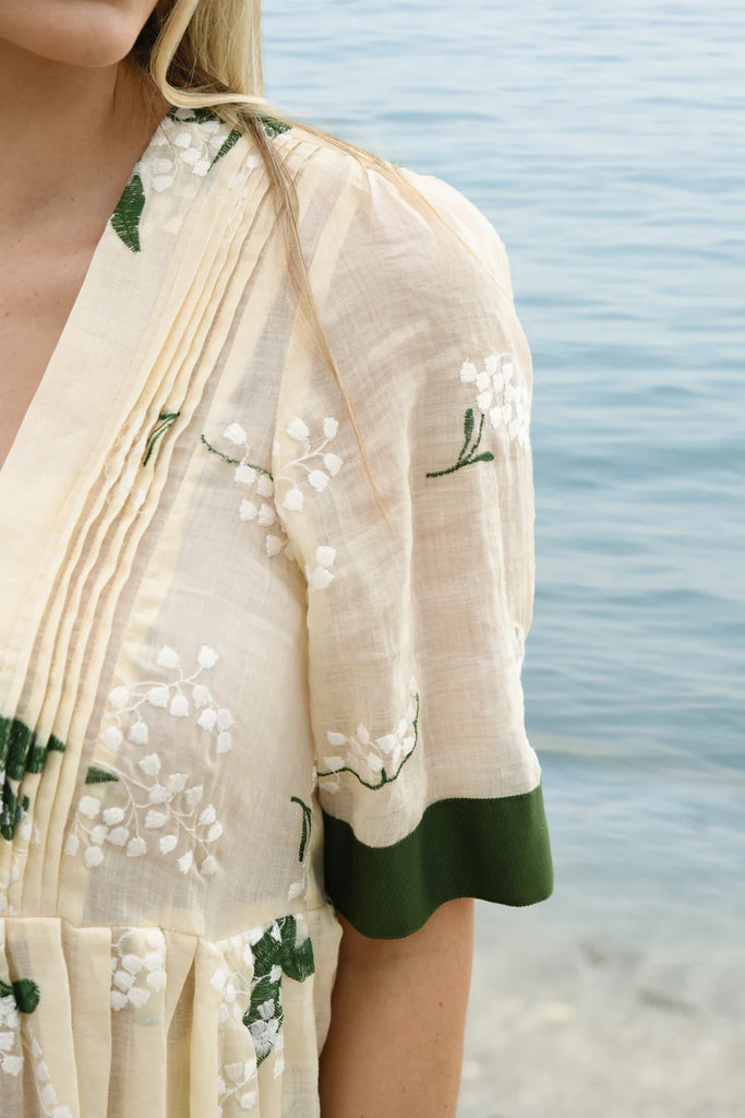 Delicate lily of the valley embroidery adds whimsical charm to the 'My Lips are Sealed' dress. Intelligently crafted in the 'Lily of the Valley' embroidered ramie, this dress sports a flattering cut with a nipped in waist and full pleated skirt. Pintuck detailing at the bodice and contrasting green grosgrain are the final touches to this romantically summer dress.