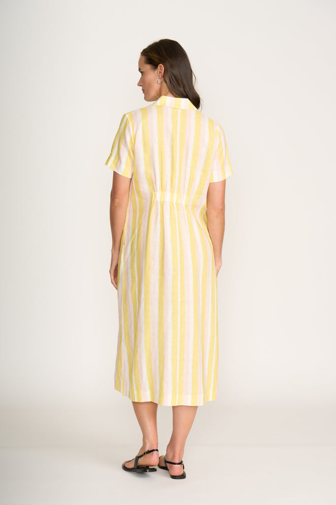 This contemporary shirt dress strikes the perfect balance between style and comfort. Featuring a gentle stripe pattern in buttery yellow, blush, and ivory shades, it stands out with subtle elegance. The crisp collar, button-down front, and softly tailored back waist create a refined look. The A-line midi skirt includes side splits for effortless movement, making it ideal for the office, weekend outings, or anytime in between.