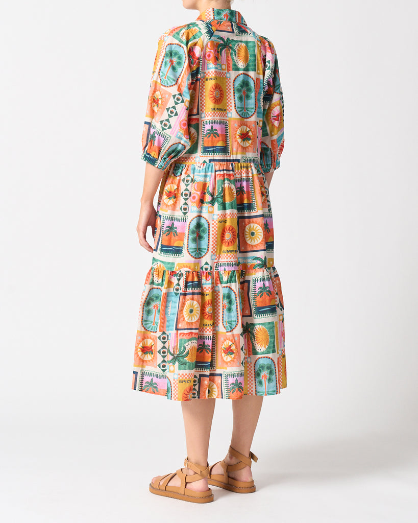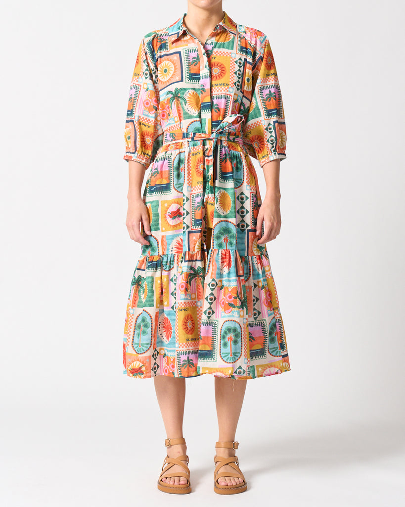 Introducing the Tuscany Dress in our vibrant Spicy Summer print. With its tiered midi silhouette and playful puff sleeves, this style is all about easy movement and standout charm. Designed with a collared neckline, button front, and a removable waist tie for added shape, it blends casual comfort with a polished edge. Made from crisp cotton poplin, it’s a breathable go-to for sunny days, spontaneous outings, and everything in between.