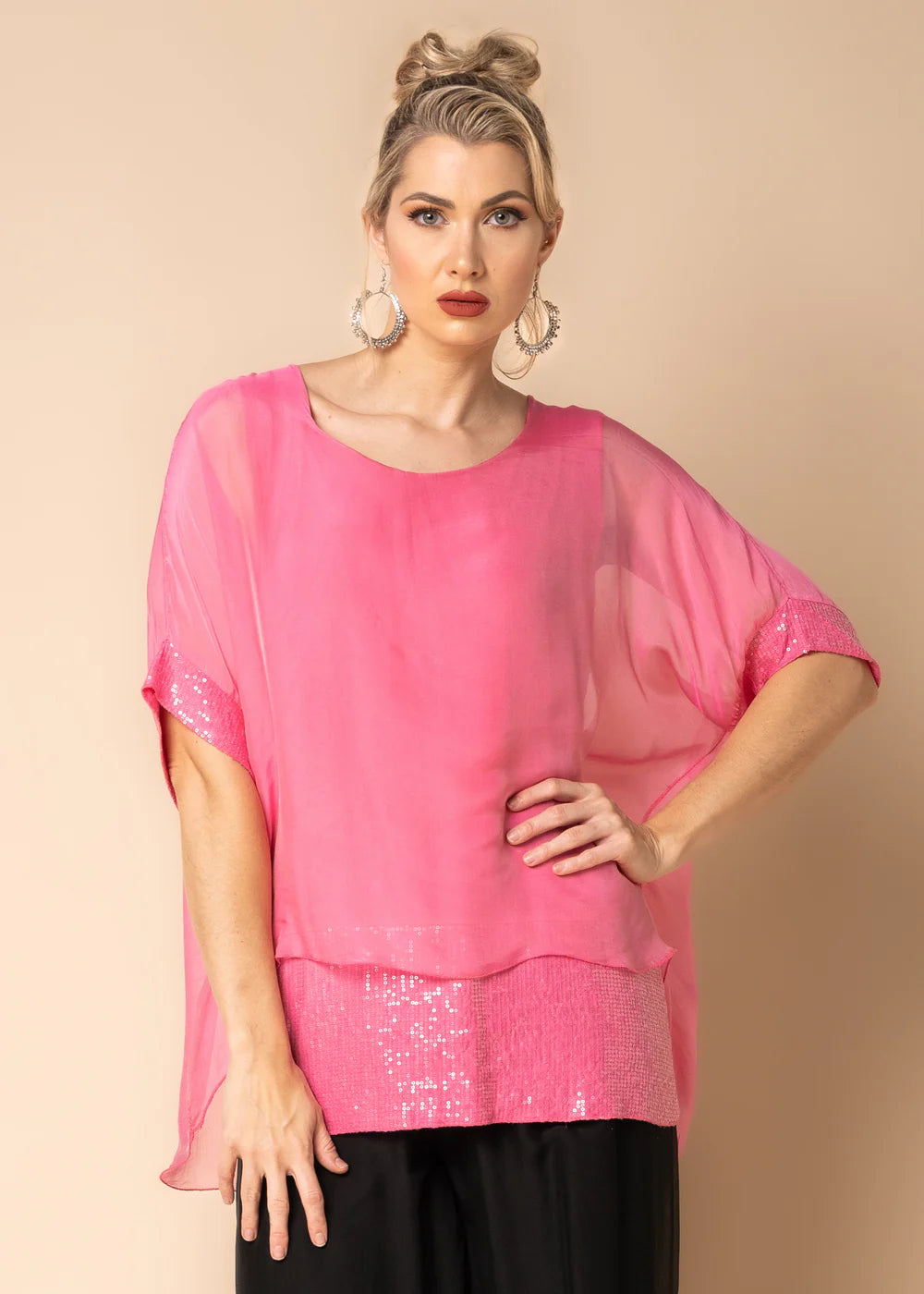 This has become one of our staple tops as it is requested by you time and time again. Round neck, short sleeve with lovely sequins around arms and a wide band across the hemline. It fits so many body shapes and is so flattering.