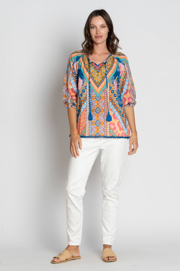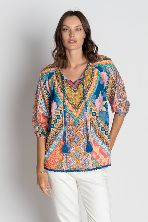 The LulaSoul Danai Top is a relaxed, easy-wear style crafted from 100% cotton with a striking digital placement print. Featuring a scooped neckline with ties, front split, and delicate shirring with soft gathers, it offers effortless comfort and flattering detail. The ¾ raglan sleeves with elastic hems, side splits, and braid edging on the hem add a chic finish. Designed in Australia, this versatile top pairs perfectly with denim, linen pants or white.