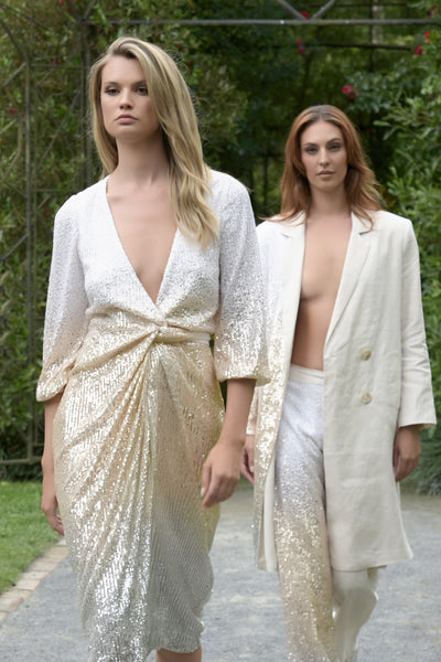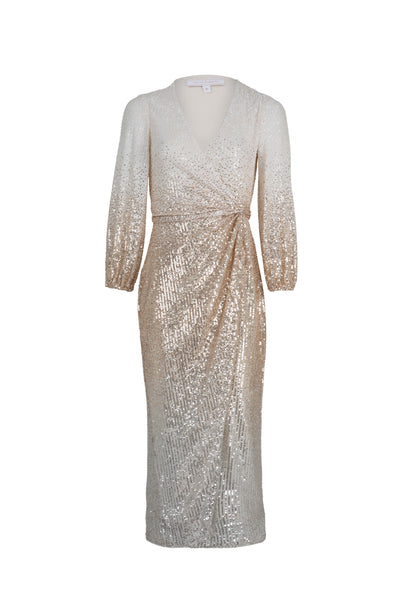Ombre sequins make a glam statement with the ‘Wrap & Rhyme’ dress. Featuring a wrap front, this dress grants multi-styling abilities, whether tied as a classic wrap cross over tied at the side, or knotted at the front with. Whichever your preference this dress is a true ode to feminine form.